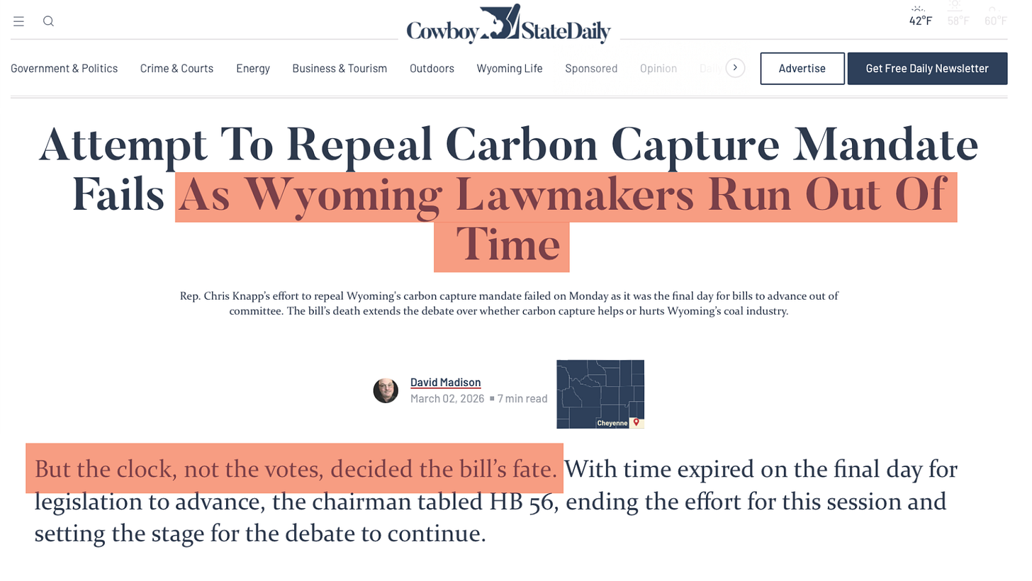 Running cover for the Senate Minerals Committee, Cowboy State Daily’s David Madison falsely reported that WYFC Vice Chairman Chris Knapp’s bill to repeal Wyoming’s woke carbon capture mandates died because lawmakers simply ran out of time.