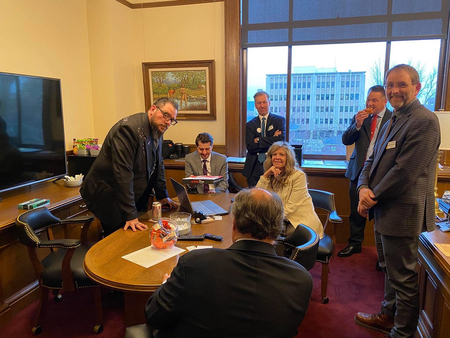 All the while, a small group of Senators shared a pizza with a left wing registered lobbyist who doubles as a legislative aide to Senate leadership.