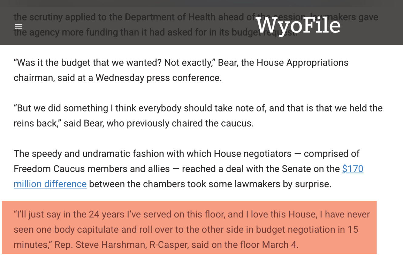 Making no effort to correct the blatant falsehood claimed by Representative Harshman on the House floor and instead reporting it as fact, WyoFile unsurprisingly omits the truth behind the legislature’s budget negotiations.